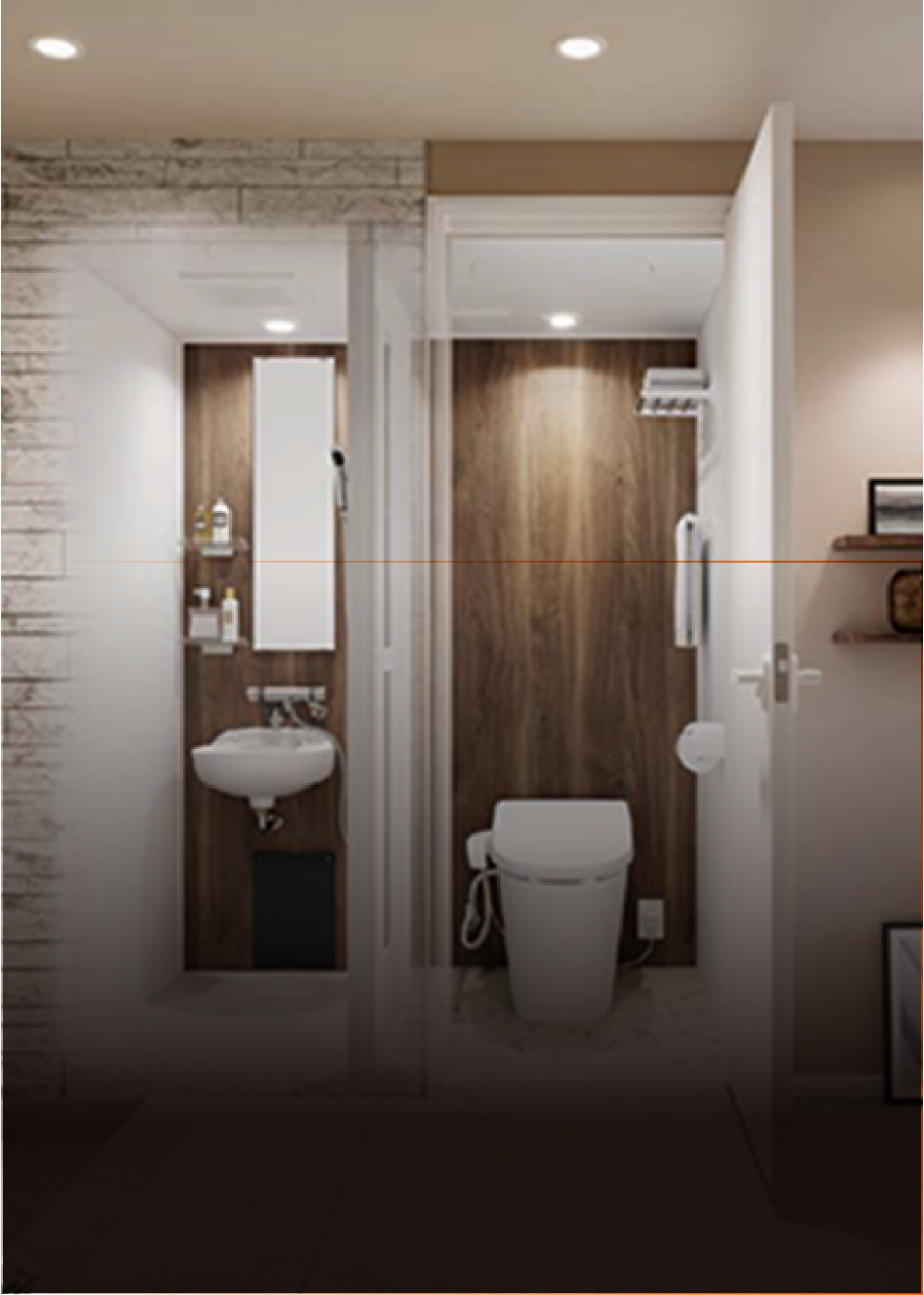 3点ユニットバスを解体し、シャワー+独立洗面に刷新。長期滞在者向けの快適性を重視したリノベーション事例。