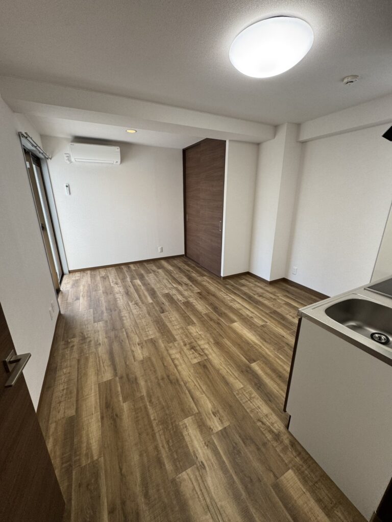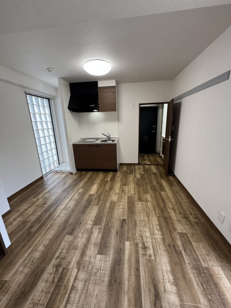 今回は、従来の明るすぎる床材から、深みのあるヴィンテージ風の木目調フロアタイルへ一新。キッチンや建具の面材と色調を合わせることで、コンパクトなワンルームながらも高級感のある大人な空間を演出しました。
